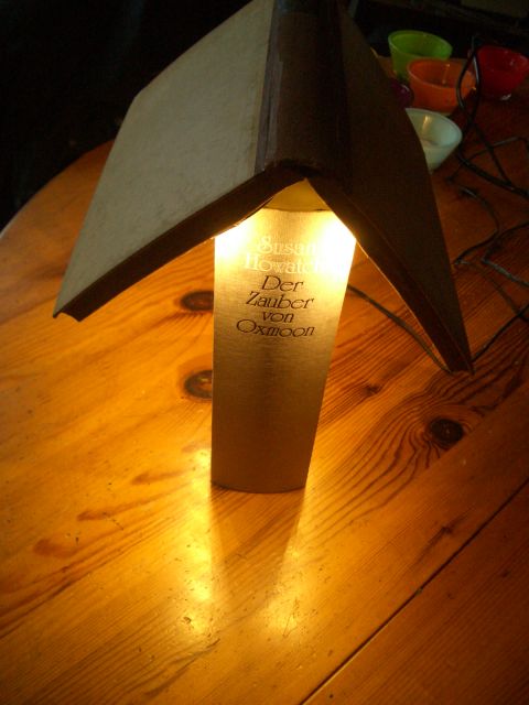 LED Buchlampe aus alten, teilweise zerissenen Büchern.